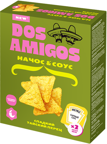 Упаковка DOS AMIGOS изготовлена из картонного материала, которая легко трансформируется в стильный поднос. Это делает сервировку начосов и соусов удобной и элегантной, добавляя дополнительное удобство для потребителя.