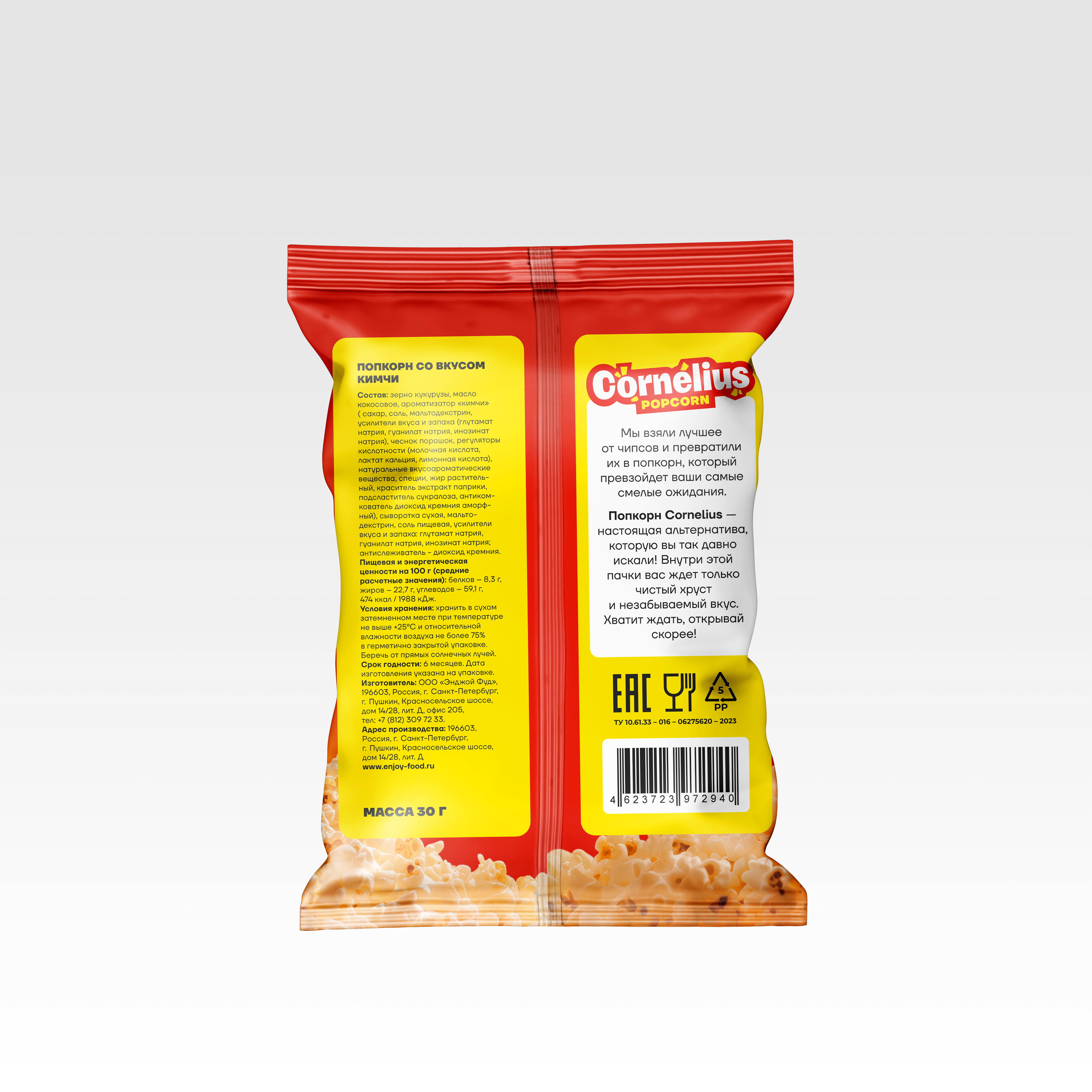 Дерзкий вызов привычному вкусу! Запах кимчи, в меру острый и дразнящий встречается с тёплым ароматом свежеиспеченного попкорна.